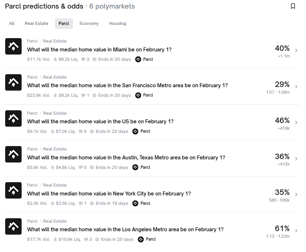 폴리마켓은 최근 Parcl과 파트너십을 맺고 부동산 예측 시장을 출시한다고 지난 5일 발표했습니다. 이에 따라 RWA 오라클 서비스인 Parcl의 일일 주택 가격 지수를 활용해 주요 도시의 부동산 가격 변동을 예측할 수 있게 됩니다. 예측 시장에 대한 관심이 갈수록 늘어나는 요즘, 이를 통해 정치, 스포츠를 넘어 부동산 분야로까지 예측 시장을 확장하면서 폴리마켓의 성장이 더욱 가속화될 것으로 보입니다.